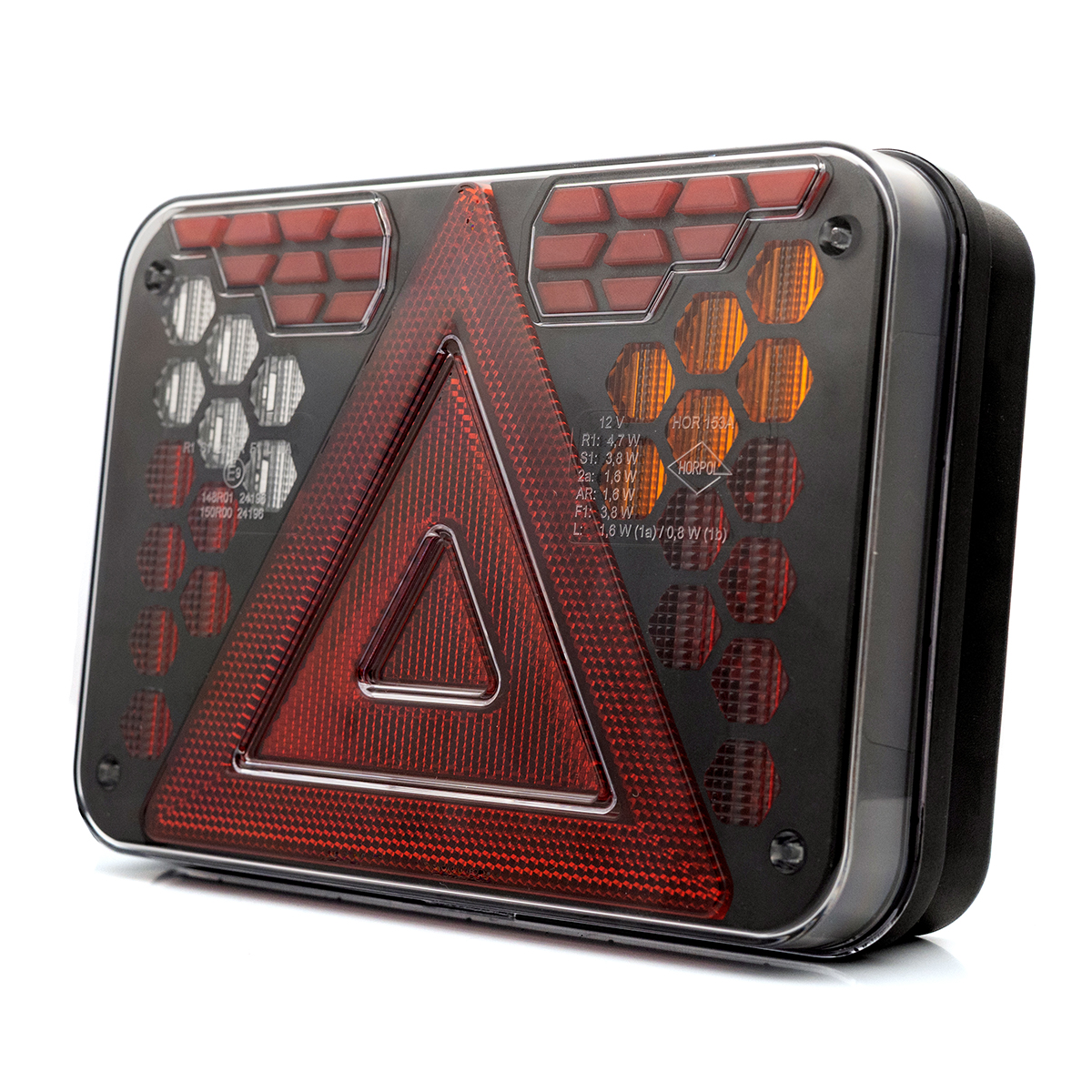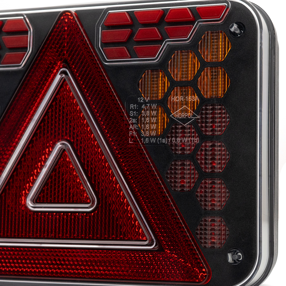 HORUS LZD 3216 ist eine moderne Rückleuchte, die für Auto-, landwirtschaftliche und Spezialanhänger konzipiert ist, kompakt dimensioniert und mit maximaler Haltbarkeit im Blick. Das Design der Lampe basiert auf einzelnen, präzise geformten geometrischen Modulen, die vor dem Hintergrund des tiefen Schwarzes des Körpers eine kohärente und wirkungsvolle Lichtkomposition erzeugen. Das Ganze ist mit einem langlebigen, transparenten Polycarbonat-Lampenschirm geschützt, der gegen mechanische Schäden und Arbeiten in schwierigen Umgebungen resistent ist.