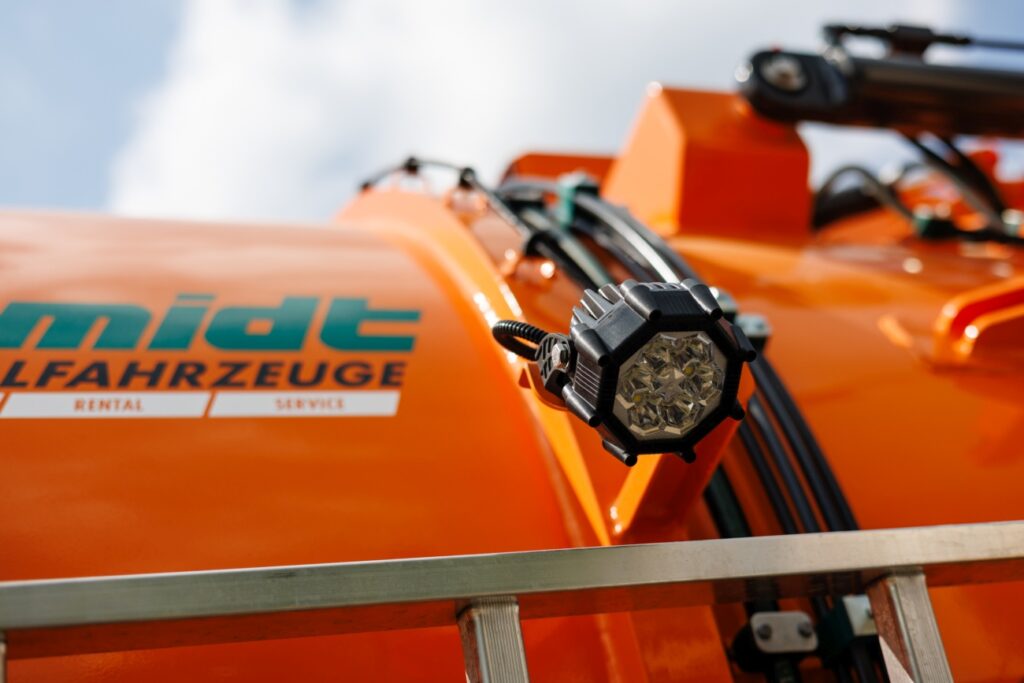 Bei Sprühgeräten ist eine präzise Ausleuchtung der Arbeitsgestänge erforderlich. Der enge Abstrahlwinkel und die weiße Lichtfarbe ermöglichen eine präzise Beobachtung des Flüssigkeitsstroms.